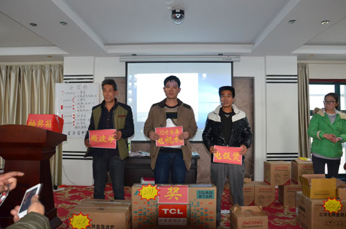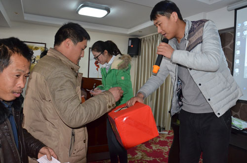 會(huì)議中由張老師為果農(nóng)朋友講解果樹種植管理技術(shù),果農(nóng)朋友全都被張老師豐富的果樹管理技術(shù)所吸引,還有宋老師的套餐分析,讓果農(nóng)紛紛稱贊其農(nóng)藥知識(shí)的專業(yè)性,直到指導(dǎo)老師分享完果農(nóng)們還意猶未盡。隨后,訂貨開始,2015年在臨猗建立的套餐示范園中,果農(nóng)們普遍反映效果較好,再加上直營(yíng)部******的技術(shù)服務(wù),果農(nóng)們沒有過多猶豫,紛紛掏錢預(yù)定套餐,并獲得抽獎(jiǎng)資格。