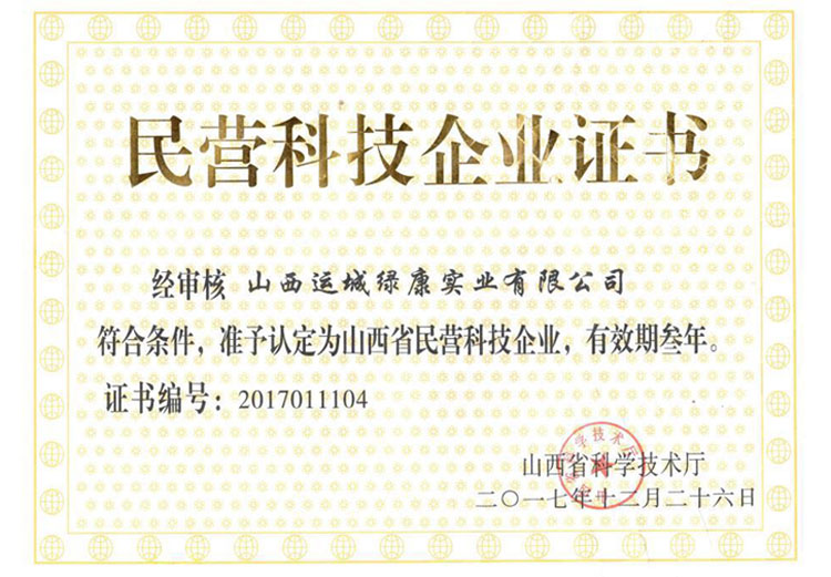 日前,山西省科學技術廳授予我運城綠康實業(yè)公司《民營科技企業(yè)證書》,正式認定我公司為山西省民營科技型企業(yè)(證書號:201701110)。