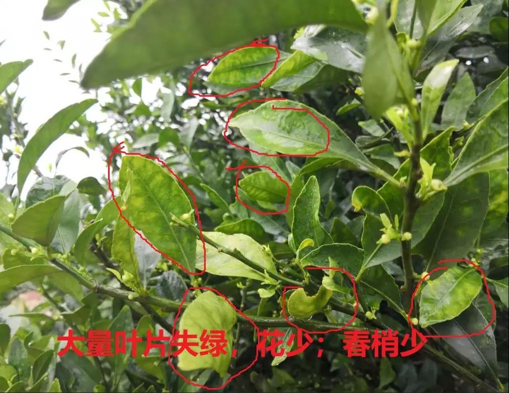 2、2017年收果前使用兩次甜蜜素的果樹--葉片黃、樹勢弱、花芽少、春梢少?!?018年3月20日觀察】