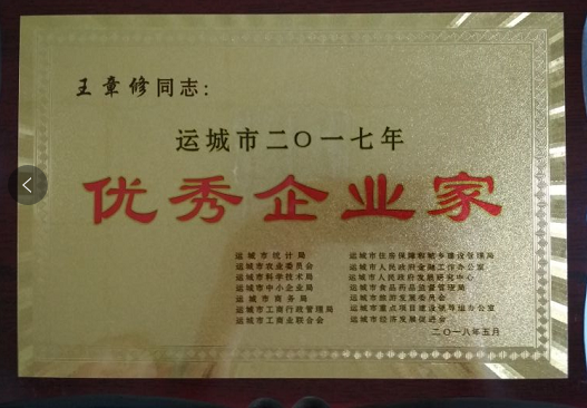日前,由運城市政府、市農業(yè)委員會聯(lián)合市工商局、商務局、食品藥品監(jiān)督管理局等十四個行政管理部門共同為全市優(yōu) 秀企業(yè)及企業(yè)家授予表彰,我公司憑借多年來積累的可靠的產(chǎn)品質量和良好的社會信譽度榜上有名,公司被評為“運城市二零一七年度誠 信企業(yè)”,公司領航人王章修董事長被評為“運城市二零一七年度優(yōu) 秀企業(yè)家”。在這個良好發(fā)展的平臺上,公司已制定出新發(fā)展的策略,同時,也將會有更強的競爭力和發(fā)展力,望全體員工團結一致、齊心協(xié)力,與企業(yè)共同進步、共同發(fā)展,書寫新畫卷。